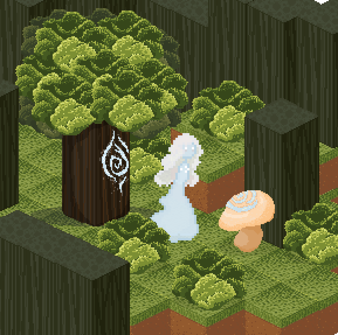 A tree. This is a healed tree, the healthy version of the corrupted wall trunks. Like with the mushroom, it features Rhiza's spiral. I ran out of time to make the leafage from scratch, so I used a bunch of layer bushes.